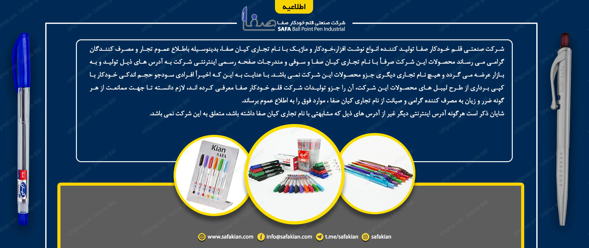در شرکت صنعتی قلم خودکار صفا اخبار و اطلاعرسانیهای شفاف و همه جانبه پیرامون فعالیتهای ارگانی و روند تولید محصولات در قالب نشریه های داخلی در اختیار مشتریان و کارفرمایان عزیز قرار میگیرد.