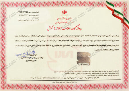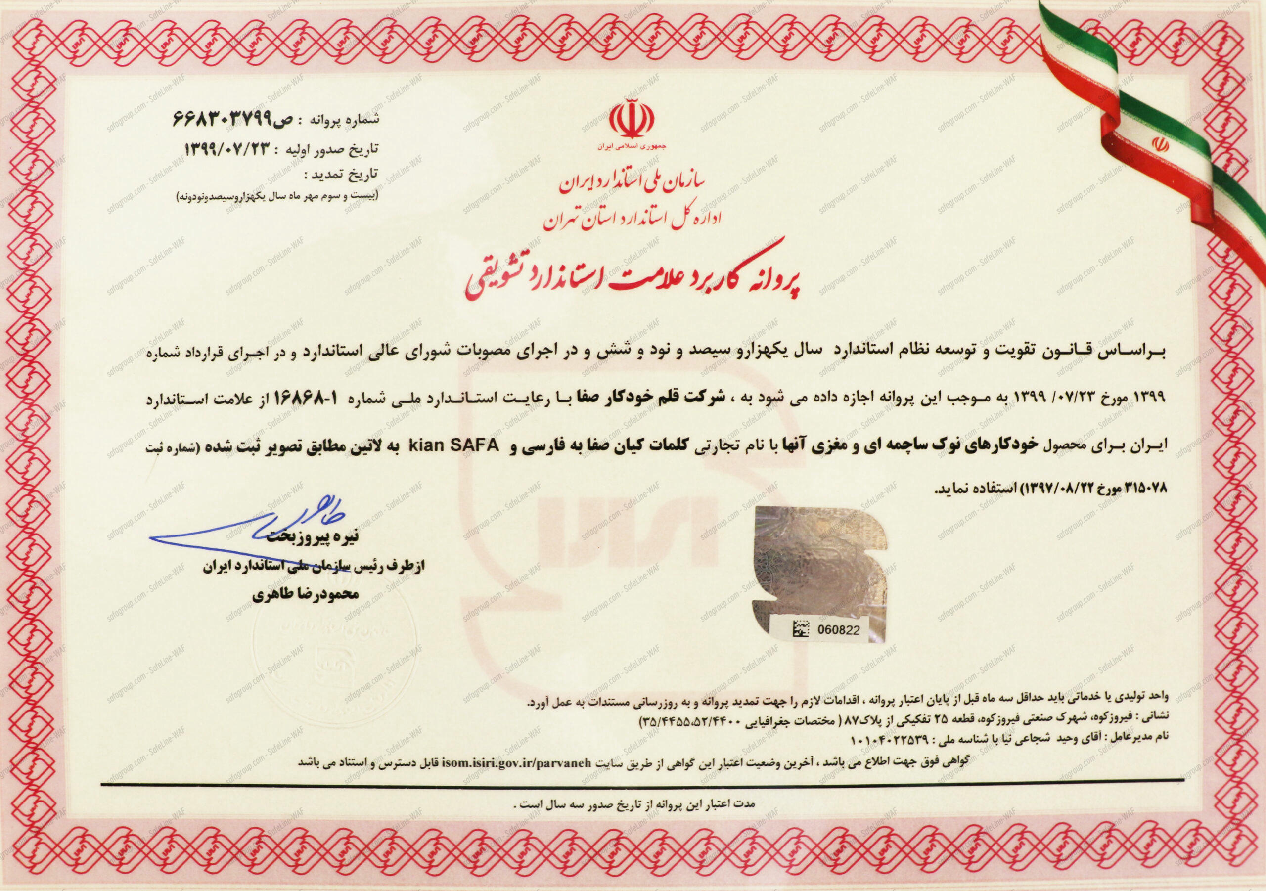با تلاش پرسنل زحمت کش این شرکت و بهره گیری از مهارت فنی مهندسین و تجهزات مدرن و به روز تولیدی و آزمایشگاهی این شرکت, کلیه محصولات این شرکت مزین به درج نشان ملی استاندارد ایران گردید که این رویداد مهم تایید دیگری بر کیفیت بالای محصولات این شرکت است.